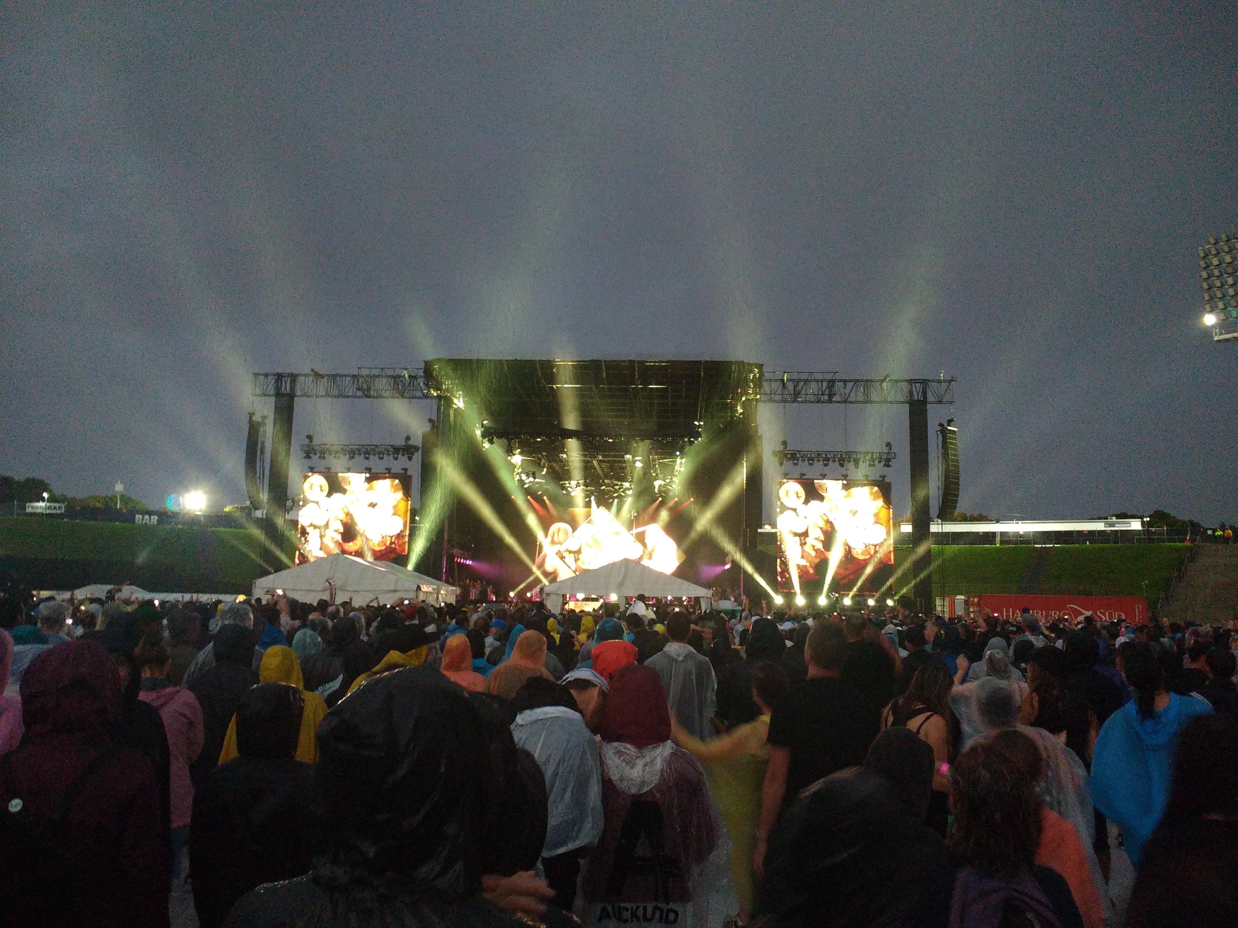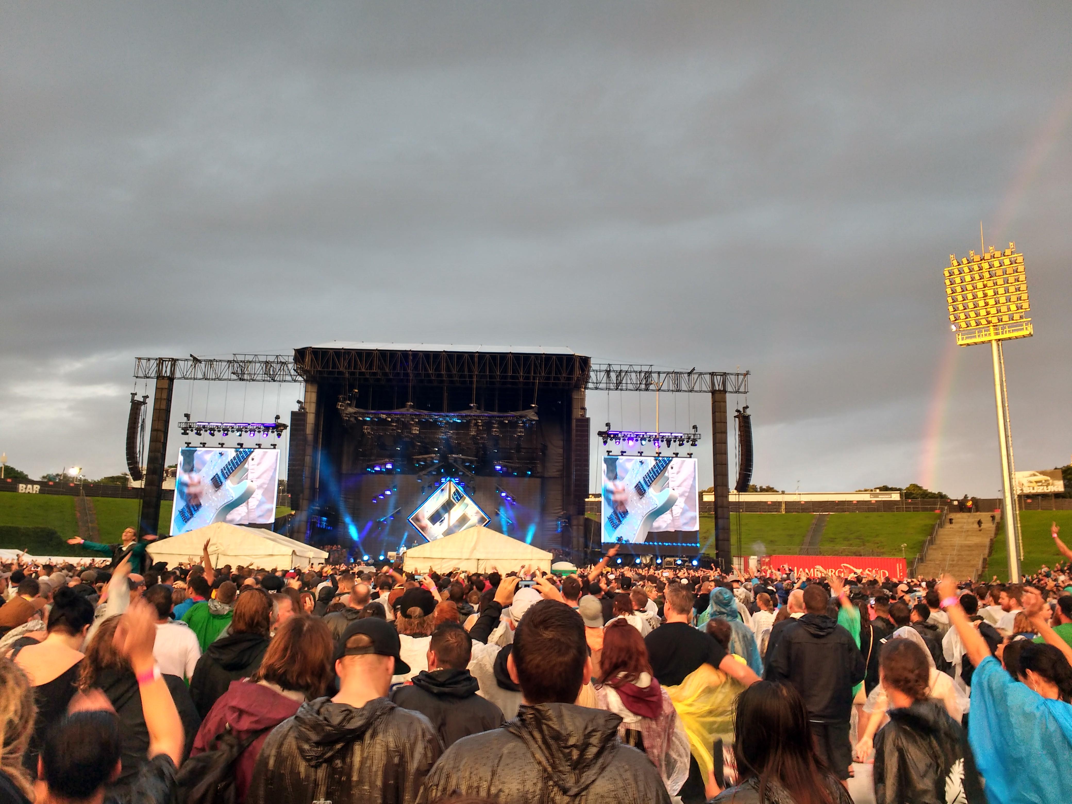 Dann kamen ziemlich bald die Foo Fighters. Dave Grohl hatte super Laune und war völlig baff, dass so viele bei dem „Fucking Weather!“ da waren. Achja, hab ich das Wetter schon erwähnt? – Es hat komplett durch geregnet, so nass war ich noch nie… Ein Lieblingsspruch von Dave war, dass die Foo Fighters bei ihrem letzten Auftritt in Auckland ein Erdbeben verursacht und den Regen vertrieben hätten. (Beides hat diesmal nicht geklappt.) Trotzdem 3 Stunden super Stimmung mit allen Hits, vielen Solis und Coverversionen von Kiss, Queen und Alice Cooper. Letzter Song: Everlong!